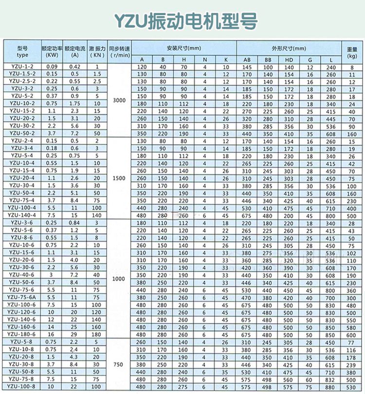 由上表我們可以清晰地看到,YZUL振動電機有不同的規(guī)格型號,功率越大,價格就會越高。