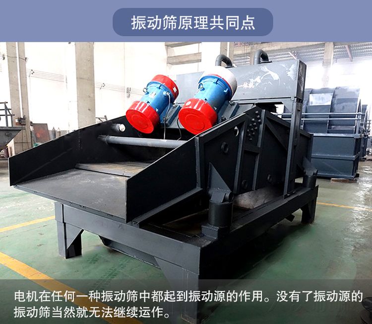 無論是哪種振動篩其結構中都少不了電機,這是因為電機在任何一種振動篩中都起到振動源的作用。沒有了振動源的振動篩當然就無法繼續運作。不同振動篩的原理共同之處就是振動電機接通電源后,電機上的偏心塊產生激振力,帶動整個篩框篩網的振動,物料在振動作用下與篩面做相互運動,小于篩孔大小的物料就會穿過篩網到達下一層級,而篩不下去的物料則通過振動篩出料口排出,以此類推,從而達到層層分級的效果。