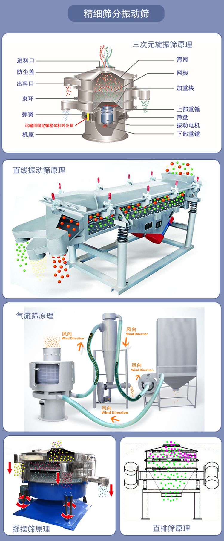 振動篩又被叫做篩粉機、電動篩,是一種適合與精細物料篩分的振動篩分機械設備,被各行各業所廣泛使用,尤其體現在食品行業和化工行業的生產活動中。振動篩設備分類廣泛,精細篩分設備是用處很廣的,那么小編今天就和大家分享精細篩分中各種篩分設備的原理。